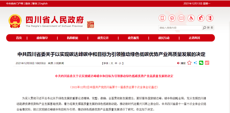 12月8日,中共四川省人民政府在官網(wǎng)發(fā)布了《中共四川省委關(guān)于以實現(xiàn)碳達峰碳中和目標為引領(lǐng)推動綠色低碳優(yōu)勢產(chǎn)業(yè)高質(zhì)量發(fā)展的決定》(以下簡稱《方案》)。