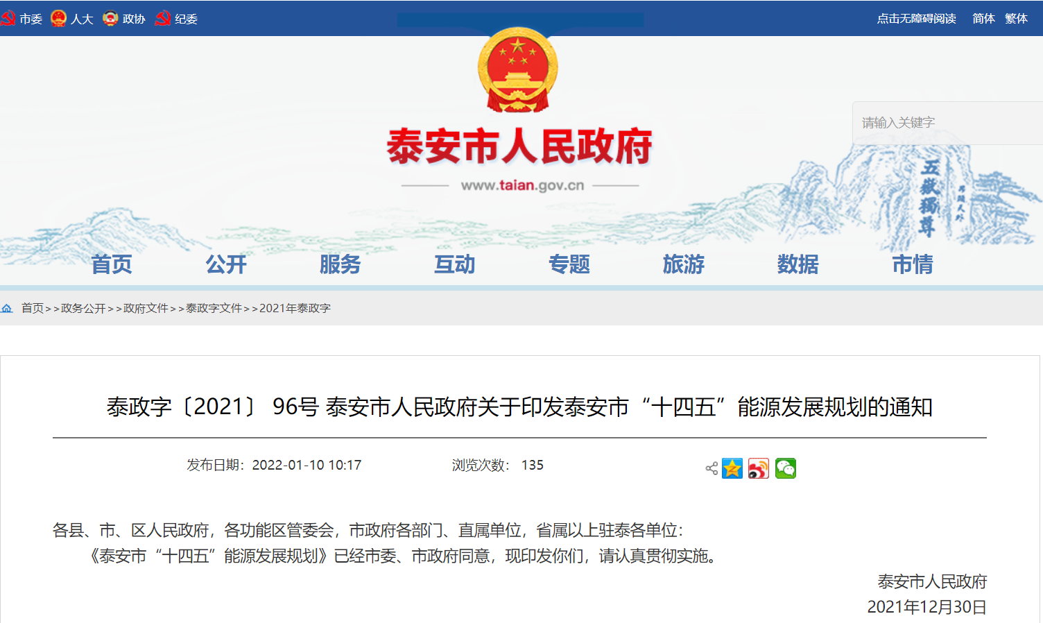 文章來源:地大熱能 發(fā)布作者:山東省泰安市人民政府 發(fā)表時(shí)間:2022-01-12 09:06:56瀏覽次數(shù):4827