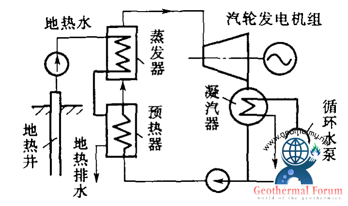 雙循環(huán)地?zé)岚l(fā)電系統(tǒng)是利用地下熱水來加熱某種低沸點(diǎn)工質(zhì),使其進(jìn)入汽輪機(jī)工作的地?zé)岚l(fā)電系統(tǒng),又稱中間介質(zhì)法或低沸點(diǎn)工質(zhì)循環(huán)。它是為克服閃蒸地?zé)岚l(fā)電系統(tǒng)的缺點(diǎn)而出現(xiàn)的一種循環(huán)系統(tǒng)。地下熱水用深井泵抽到地面進(jìn)入電站內(nèi)的蒸發(fā)器,加熱某一種低沸點(diǎn)介質(zhì)(如氟里昂11、氯乙烷等),使之變?yōu)榈头悬c(diǎn)介質(zhì)蒸氣,然后通入汽輪機(jī)做功發(fā)電,汽輪機(jī)排出的乏汽經(jīng)凝汽器冷凝成液體,用工質(zhì)泵再打回蒸發(fā)器重新加熱,循環(huán)使用。為充分利用地?zé)崴?/a>的余熱,讓從蒸發(fā)器排出的地?zé)崴?/a>經(jīng)過一個(gè)預(yù)熱器先預(yù)熱來自凝汽器的低沸點(diǎn)工質(zhì)液體,使其溫度上升至接近蒸發(fā)器內(nèi)的工質(zhì)飽和溫度,再進(jìn)入蒸發(fā)器。為了保證從地?zé)峋?/a>來的地?zé)?/a>水在輸送過程中不閃蒸成蒸氣和不使溶解氣體從水中逸出,在管路中的熱水始終保持超過其溫度對應(yīng)的飽和壓力。