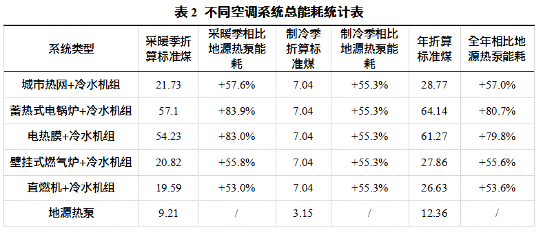 不同空調系統(tǒng)總能耗統(tǒng)計比較如表2所示。
