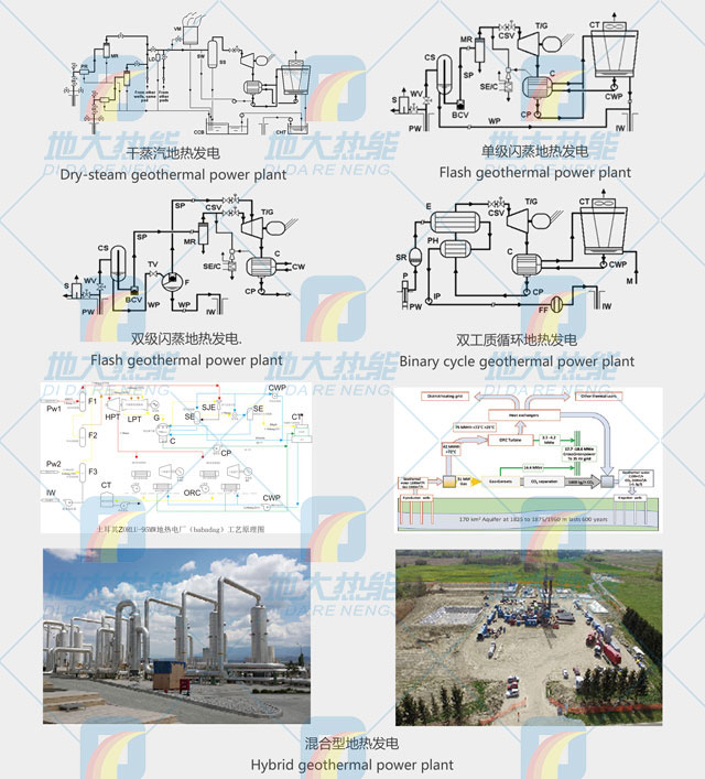 地?zé)岚l(fā)電需根據(jù)地?zé)崃黧w的溫度、壓力以及它們的水、汽品質(zhì)的不同而采取不同的設(shè)計(jì)方案。其主要類型包括:干蒸汽地?zé)岚l(fā)電、單級(jí)閃蒸地?zé)岚l(fā)電、雙級(jí)閃蒸地?zé)岚l(fā)電、一井一站地?zé)岚l(fā)電、混合型地?zé)岚l(fā)電、雙工質(zhì)循環(huán)地?zé)岚l(fā)電、干熱巖發(fā)電。