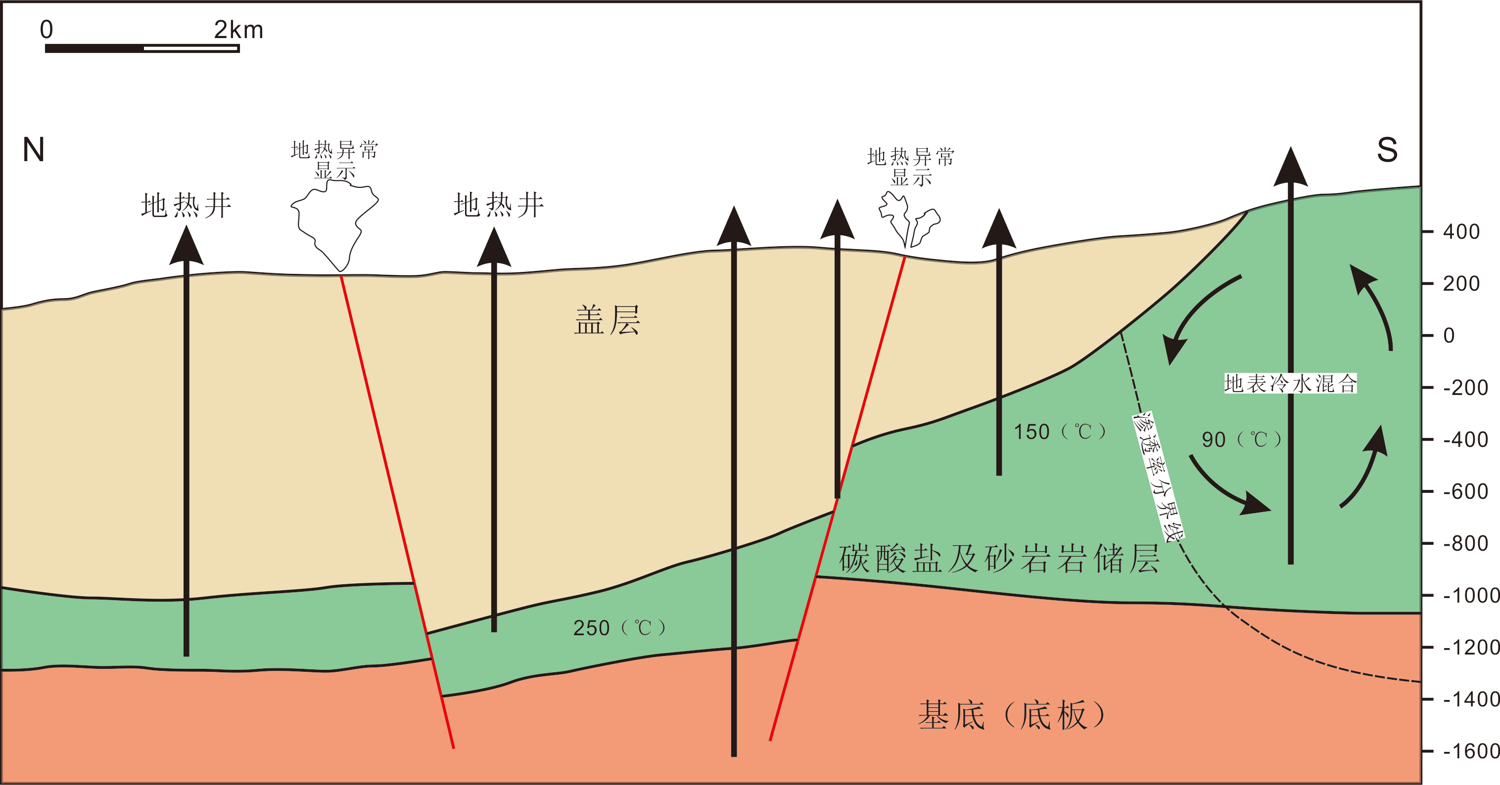 (5)變質(zhì)的托斯卡納單元,有一套角閃巖-片麻巖以及云母片巖-千枚巖,這套地層構(gòu)成了地?zé)嵯到y(tǒng)的底板地層。