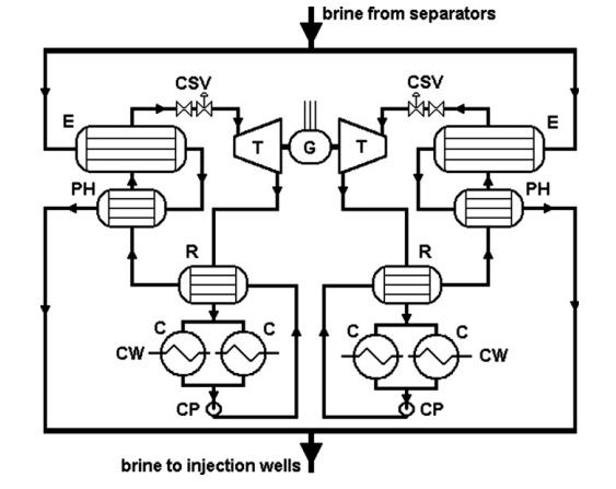 米拉瓦列斯的五號發(fā)電機組是2004年剛投入使用的。這個發(fā)電機利用從一號和二號和三號發(fā)電機組中的廢棄鹵水,通過注入井來獲取了可能回到熱儲層中的能量??偣驳陌l(fā)電量是15.5MW,發(fā)電機組中的每一個發(fā)電單元都發(fā)出7.75MW的電。每一個發(fā)電單元是有兩個渦輪組成的,驅動同一個發(fā)電機。循環(huán)工質是常規(guī)的正戊烷,C5H12。每一個單元用兩個預熱器。兩個蒸發(fā)器跟他們各自的分隔板。兩個回熱器,四個水冷凝器。這個發(fā)電機組是有澳瑪特(Ormat)提供的。