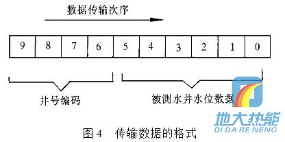 現(xiàn)在通過單片機(jī)輸出控制一組由三極管組成的電子開關(guān),由電子開關(guān)代替按鍵功能完成數(shù)據(jù)輸入.例如:要傳輸十進(jìn)制數(shù)據(jù)0,1,2,3,4,5,6,7,8,9,單片機(jī)依次輸出接通雙音頻編碼器輸入數(shù)字按鍵0,1,2,3,4,5,6,7,8,9對(duì)圖4 傳輸數(shù)據(jù)的格式應(yīng)的電子開關(guān)的控制信號(hào),則該組數(shù)據(jù)經(jīng)雙音多頻編碼器轉(zhuǎn)換為雙音頻信號(hào). 雙音多頻編碼器在單片機(jī)控制下,定時(shí)“撥通”水位監(jiān)測(cè)中心電話號(hào)碼,在水位監(jiān)測(cè)中心計(jì)算機(jī)應(yīng)答并“摘機(jī)”的情況下,通過這條已接通的電話線路,將所測(cè)的水位數(shù)據(jù),經(jīng) 過雙音多頻編碼器編碼后傳送到監(jiān)控中心. 要傳輸?shù)臄?shù)據(jù)格式為:數(shù)據(jù)長(zhǎng)度為10位十進(jìn)制數(shù),其中高四位為井號(hào)編碼,低六位為所測(cè)量的水井水位數(shù)據(jù),水位數(shù)據(jù)分整數(shù)和小數(shù)兩部分.數(shù)據(jù)傳輸?shù)姆较蚴菑母呶坏降孜?數(shù)據(jù)格式如圖4所示.